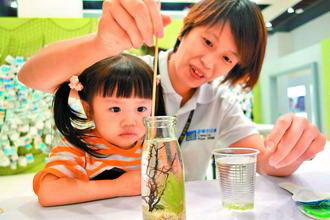 圖說:海科館在週末推出藻球瓶DIY,小巧精緻的擺設吸引小朋友目光。(攝影/記者邱奕寧)